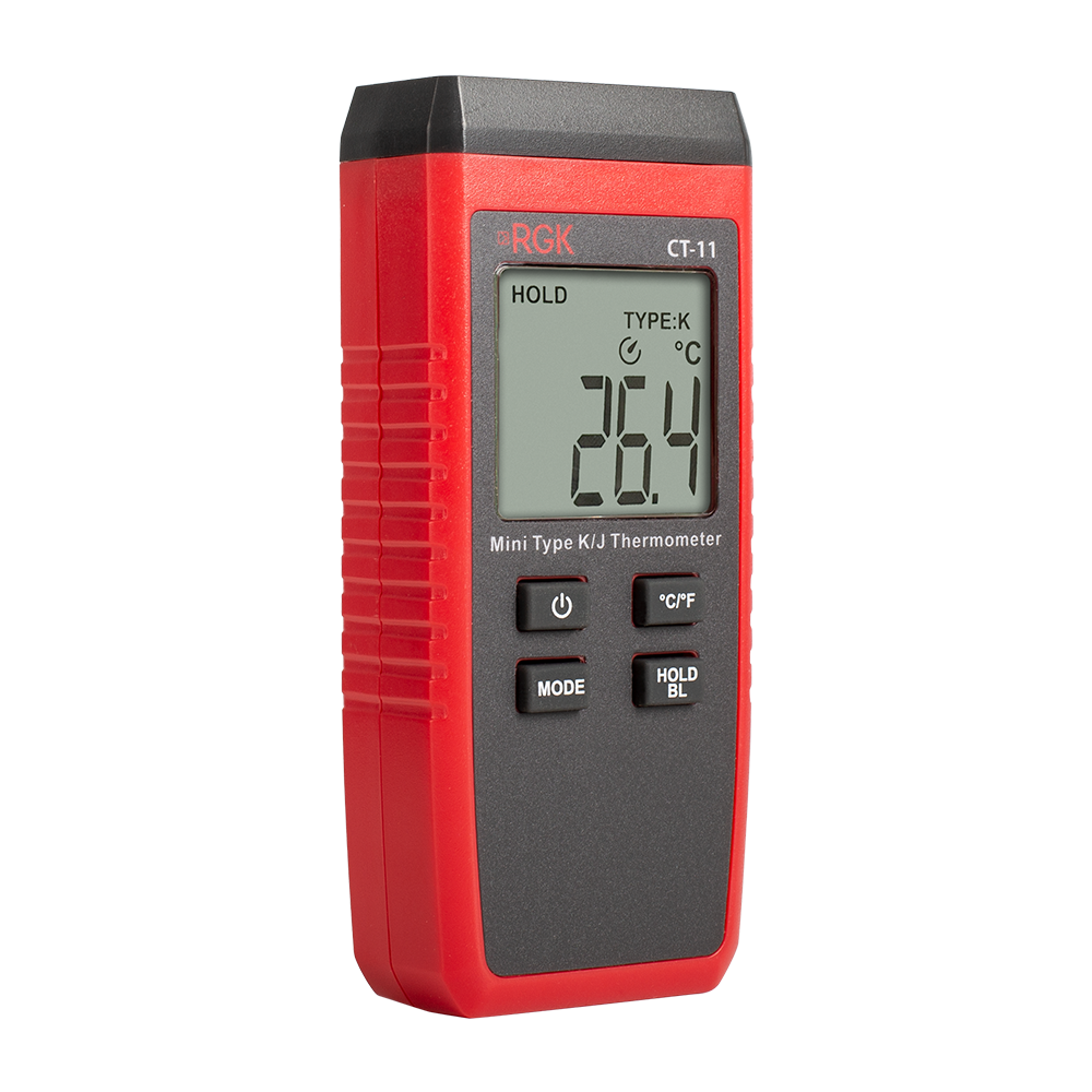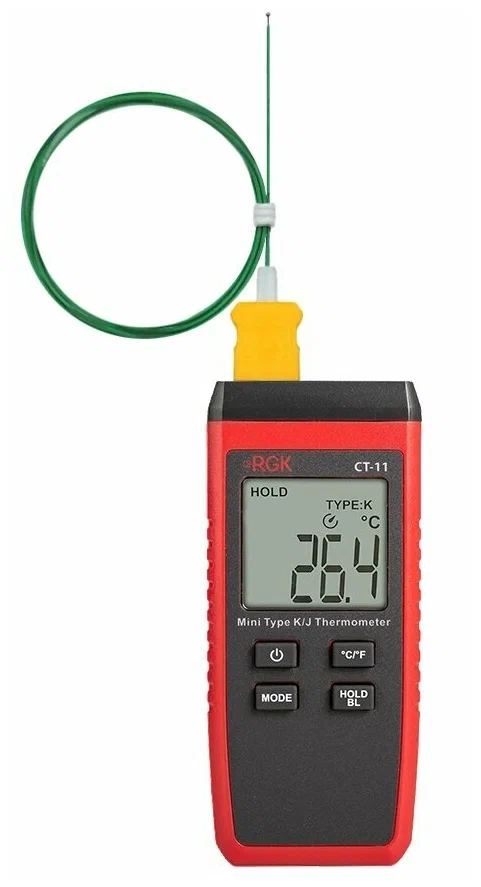 В базовом исполнении одноканальный контактный термометр RGK CT-11 измеряет температуру в диапазоне от - 40 °С до + 260 °С с погрешностью не более ± 1,5 °C. Контактный способ работы позволяет точно определить температуру любой поверхности, жидкости или газа.