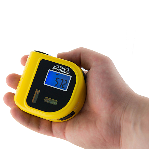 Ультразвуковой дальномер с корпусом, выполненным в виде рулетки. Портативный дальномер позволяет измерять расстояние от 55 сантиметров до 18 метров. ЖК-дисплей, оснащенный яркой подсветкой.