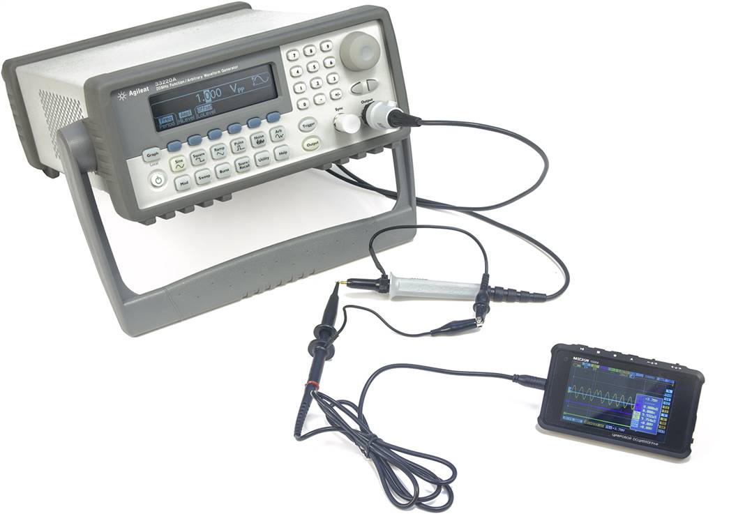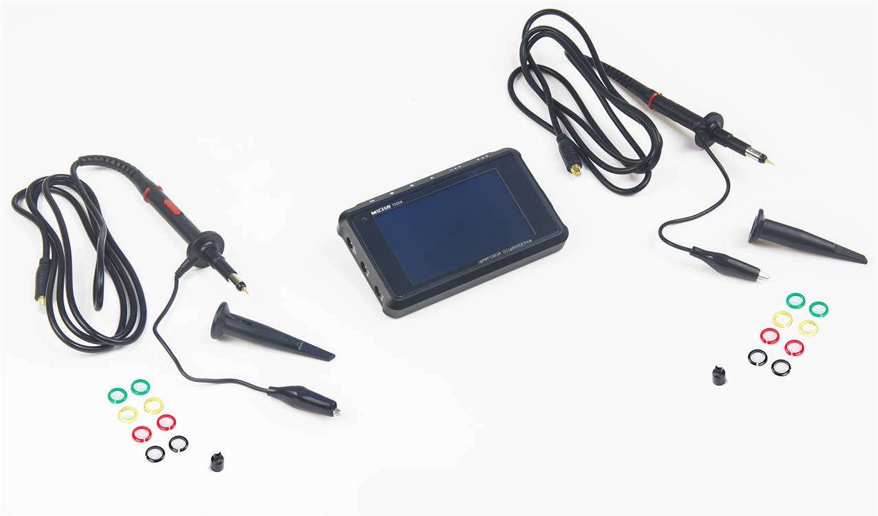 Вместе с осциллографом поставляется пара пробников для подключения к тестируемым устройствам. Прибор имеет полосу пропускания до 8 МГц, обеспечивая высокую точность при анализе и отображении на дисплее осциллограмм сигналов с частотами, не превышающими это значение. Внутреннее разрешение устройства составляет 8 бит.