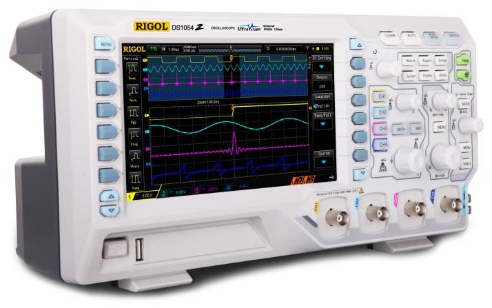 Цифровой осциллограф. 4 канала. Полоса пропускания - 50 МГц. Частота дискретизации - 1 Гвыб/с (500 Мвыб/с на 2 канала, 250 Мвыб/с - 4 канала). Макс. память - 24 М. Входной импеданс: 1 МОм. Скорость захвата 30000 осц/сек. 256 градаций яркости. Расширенная синхронизация, в т.ч. протоколы I²C, RS232, SPI. UltraVision. Курсорные измерения. 24 автоизмерения. Матем. функции. БПФ. Интерполятор: линейный, Sin(x)/x. Регистратор 5000 кадров. Самописец. Тестирование в пределах Pass/Fail. Выход синхронизации. Интерфейс: USB-host, USB-device, LAN. Дисплей: 17,8 см (7"), цветной, TFT, 800 х 480. Вес: 3,2 кг. Габаритные размеры: 313,1 x 160,8 x 122.4 мм.