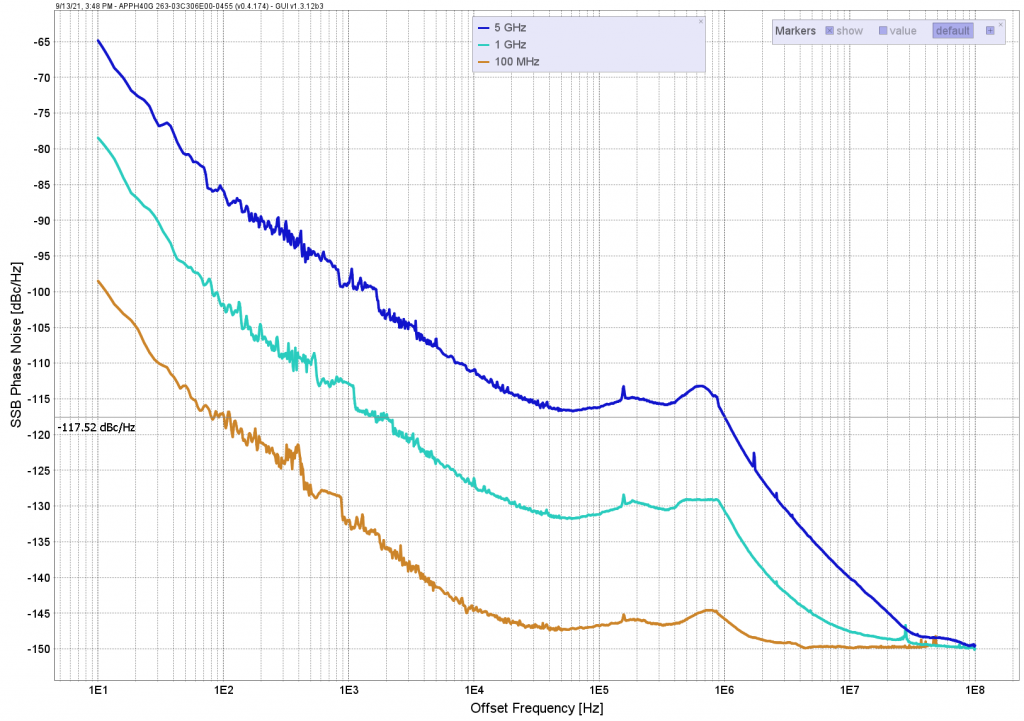 Уровень фазовых шумов соответствует генератору сигналов среднего класса, 1 ГГц 20 кГц отстройка -130 дБн/Гц.