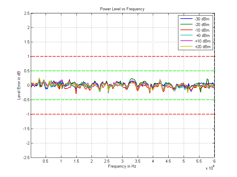 Динамический диапазон прибора от -120 дБм до +25 дБм, ниже приведем графики метрологических характеристик.